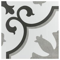For patterned tile, normally the all-time bet is to cull a color that volition blend into the tiles every bit much every bit possible so equally to not interrupt the pattern. Await to the edges of the tile to see what color volition be up against the tile the most. In this flooring tile, the black is what stands out to the eye, just the white portions are more than toward the edges of the tile, so a light grout is the more effective choice — a nighttime grout would chop the design up besides much.